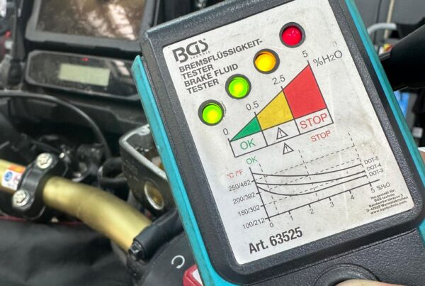 Este suficient să te uiți după pete de ulei sub motocicletă, respectiv după urme de ”transpirație” la nivelul furtunurilor. Nivelul de lichid din vasul de expansiune și din rezervorul de lichid de frână îl poți remarca printr-o inspecție vizuală, iar asta se poate spune și despre ulei – însă nu uita să îl verifici doar cu motocicleta dreaptă, nu pe cricul lateral.