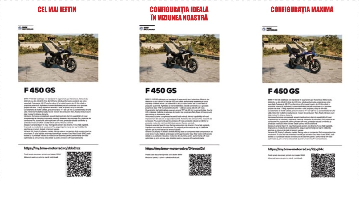 După cum vă relatam mai sus, F450 GS ne-a făcut curioși, așa că am intrat în configurator și am reușit să obținem trei variante ale aceluiași model: cea mai ieftină posibil, cea mai scumpă și configurația ideală în viziunea noastră – în limita a ceea ce permite configuratorul. Cel mai interesant aspect? Nu am ajuns la 8.000 de euro cu TVA inclusă în niciuna dintre cele trei configurații, ceea ce îl face pe F450 GS deosebit de accesibil dacă îl abordați prin sistemul de finanțare 3asy Ride. Chiar și fără avans, înseamnă o plată lunară de 100 de euro cu tot cu CASCO, cel puțin la contractele simulate de site-ul BMW Motorrad.