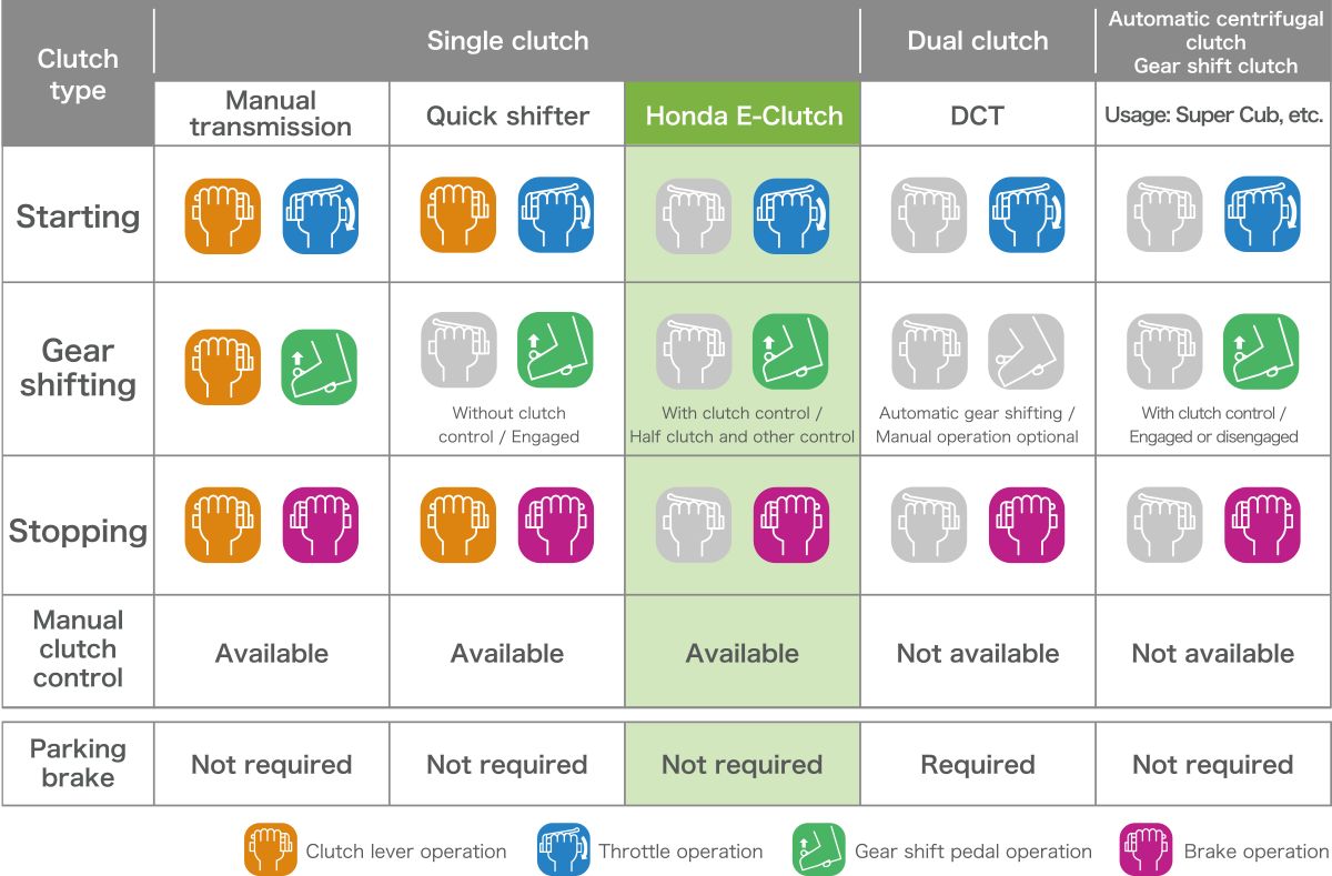 Anul 2023 a adus prezentarea sistemului E-Clutch în varianta de producție, la 13 ani după ce a debutat prima motocicletă Honda de serie echipată cu transmisie DCT. Spre deosebire de motocicletele cu DCT, cele cu E-Clutch îi permit utilizatorului să comande ambreiajul când dorește și nu sunt echipate cu sisteme care să acționeze în vreun fel schimbătorul de viteze. Aceasta ar fi cea mai simplă descriere a sistemului E-Clutch, o automatizare a acționării ambreiajului unei motociclete, dar fără a-i lua riderului controlul deplin.