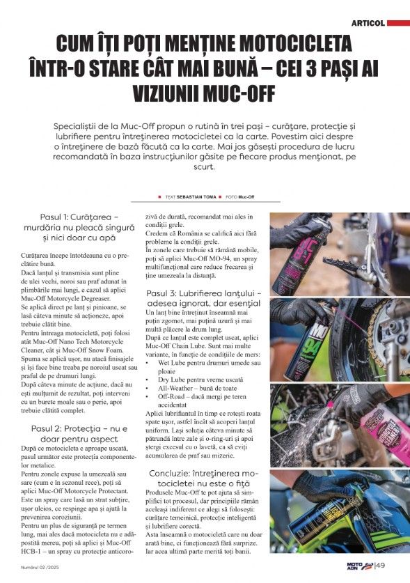 Specialiștii de la Muc-Off propun o rutină în trei pași – curățare, protecție și lubrifiere pentru întreținerea motocicletei ca la carte. Povestim aici despre o întreținere de bază făcută ca la carte. Mai jos găsești procedura de lucru recomandată în baza instrucțiunilor găsite pe fiecare produs menționat, pe scurt.