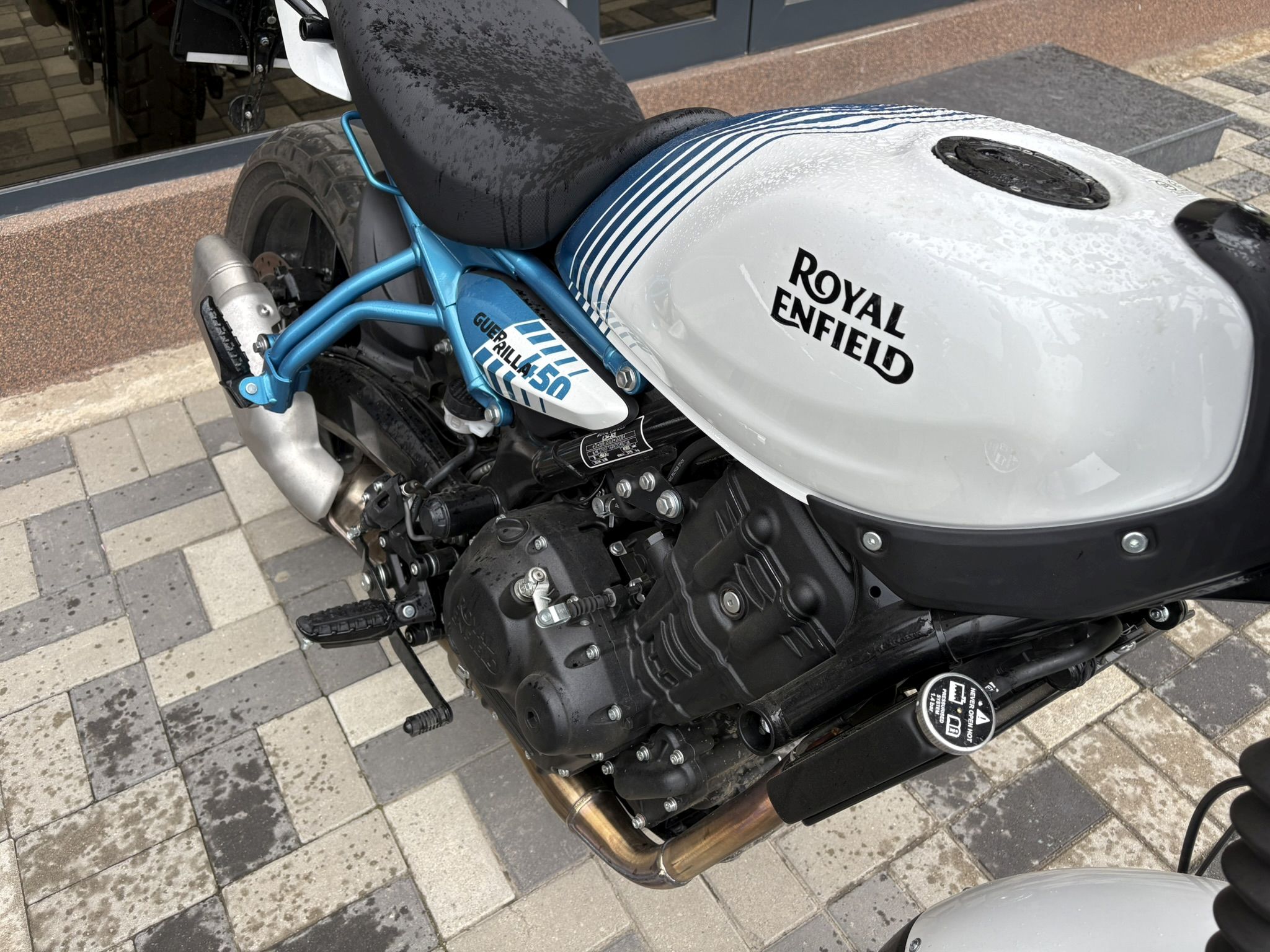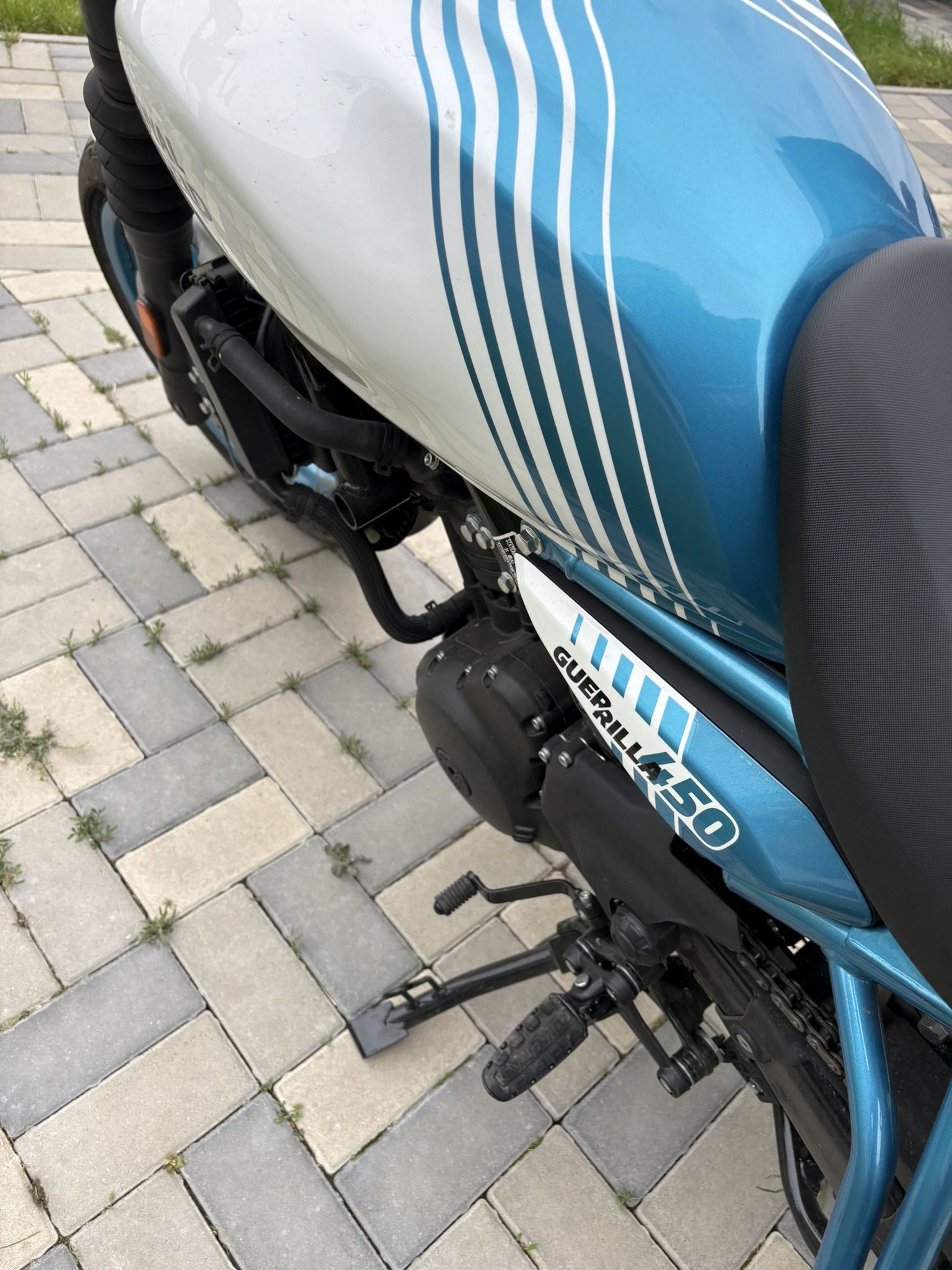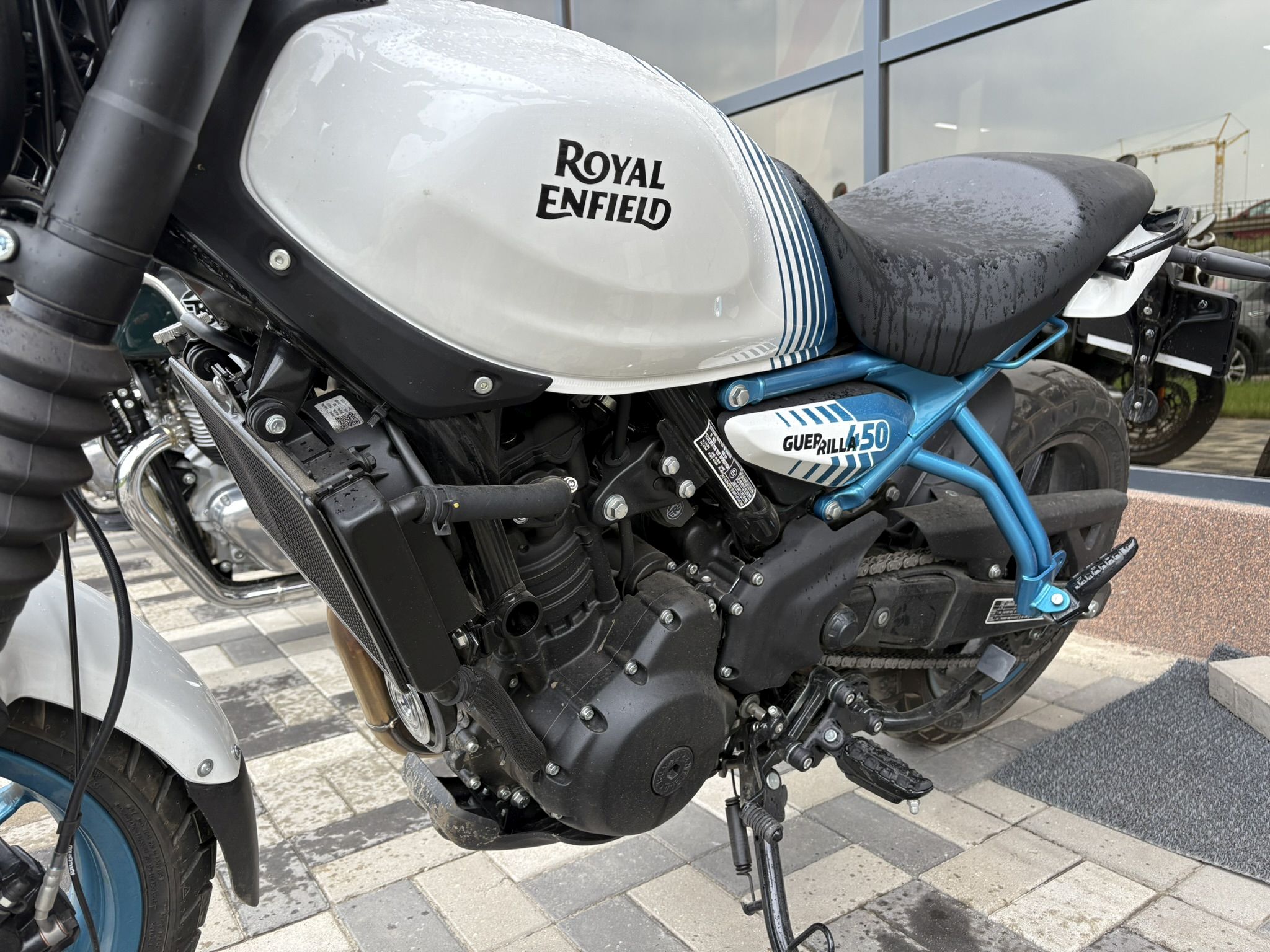 Intră în scenă Guerrilla 450, echipat tot cu propulsorul de generație nouă, Sherpa, un monocilindru ce respectă normele Euro5+. Acesta, dar și ceasurile de bord și electronica sunt comune cu Himalayan, precum și o parte din comenzi.