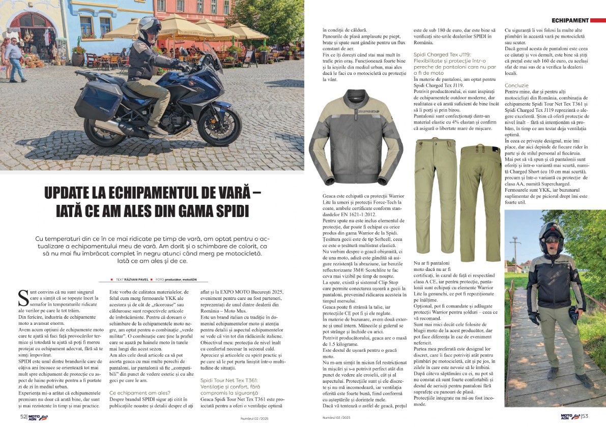 Pentru mine, dar și pentru alți motocicliști din România, combinația de echipamente Spidi Tour Net Tex T361 și Spidi Charged Tex J119 reprezintă o alegere excelentă. Știm că oferă protecție de nivel înalt – fără să intenționăm să probăm, în timp ce am testat deja ventilația optimă. În ceea ce privește designul, mie îmi place, dar aici depinde de fiecare rider în parte și de stilul personal al fiecăruia. Mai pot să vă spun și că pantalonii sunt oferiți și într-o variantă mai scurtă, numită Charged Short (cu 10 cm mai scurtă), precum și într-o variantă cu protecție  de clasa AA, numită Supercharged. Fermoarele sunt YKK, iar buzunarul suplimentar de pe piciorul drept îmi este foarte util.